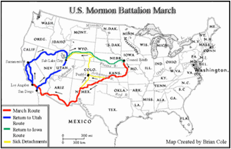 The men of the Mormon Battalion are honored for their willingness to fight for the United States as loyal American citizens. Their march of some 2 ,000 miles from Council Bluffs to California is one of the longest military marches in history. Their participation in the early development of California by building Fort Moore in Los Angeles, building a courthouse in S an Diego, and making bricks and building houses in southern California contributed to the growth of the West.