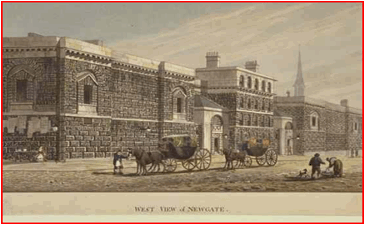 The history of the Newgate Prison probably dates back to the 12th century or perhaps earlier. After the old jail burned, a new prison was built in 1672. This prison was rebuilt in 1770-8, destroyed by riots, and rebuilt once more in 1780-3. It sits north of the Central Criminal Court on Old Bailey and near Saint Paul's Cathedral (see figure - domed building in back of the prison to the left).